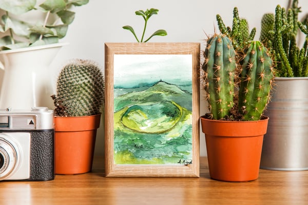 Aquarelle carte postale représentant le Pariou. Utilisation de feutres et crayons.